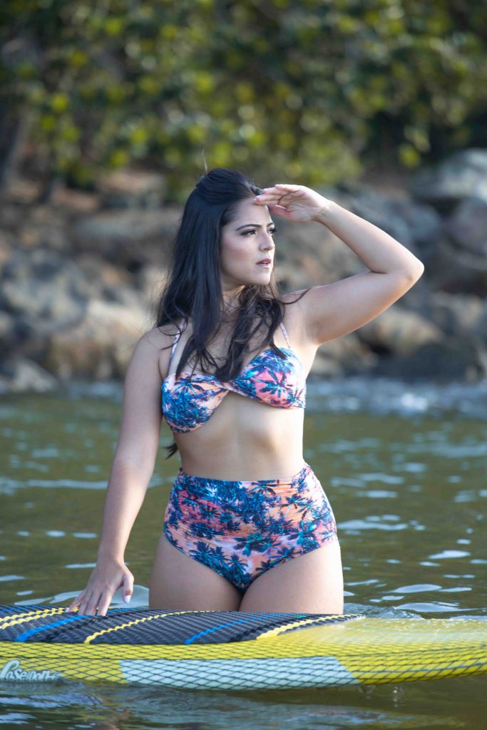 Começaremos explicando sobre o público Plus Size. Se por acaso você usa manequim G ou GG, aqui você terá algumas ideias do que usar na praia. A primeira dica que damos é que se você não tiver um estilo abusada, fuja de modelos de biquínis menores. Portanto, use uma calcinha biquíni maior, mais larguinha e que cubra boa parte do bumbum. Assim você consegue desviar o foco do seu corpo em si para a peça de biquíni. Além disso, a equipe de estilo e design da Biquini Brasil desenvolveu uma linha de produtos que afina a cintura. Sim, é isso mesmo que você leu. Vide figura seguinte de nossa modelo que usa manequim G, como ela fica elegante com os produtos da Biquini Brasil.