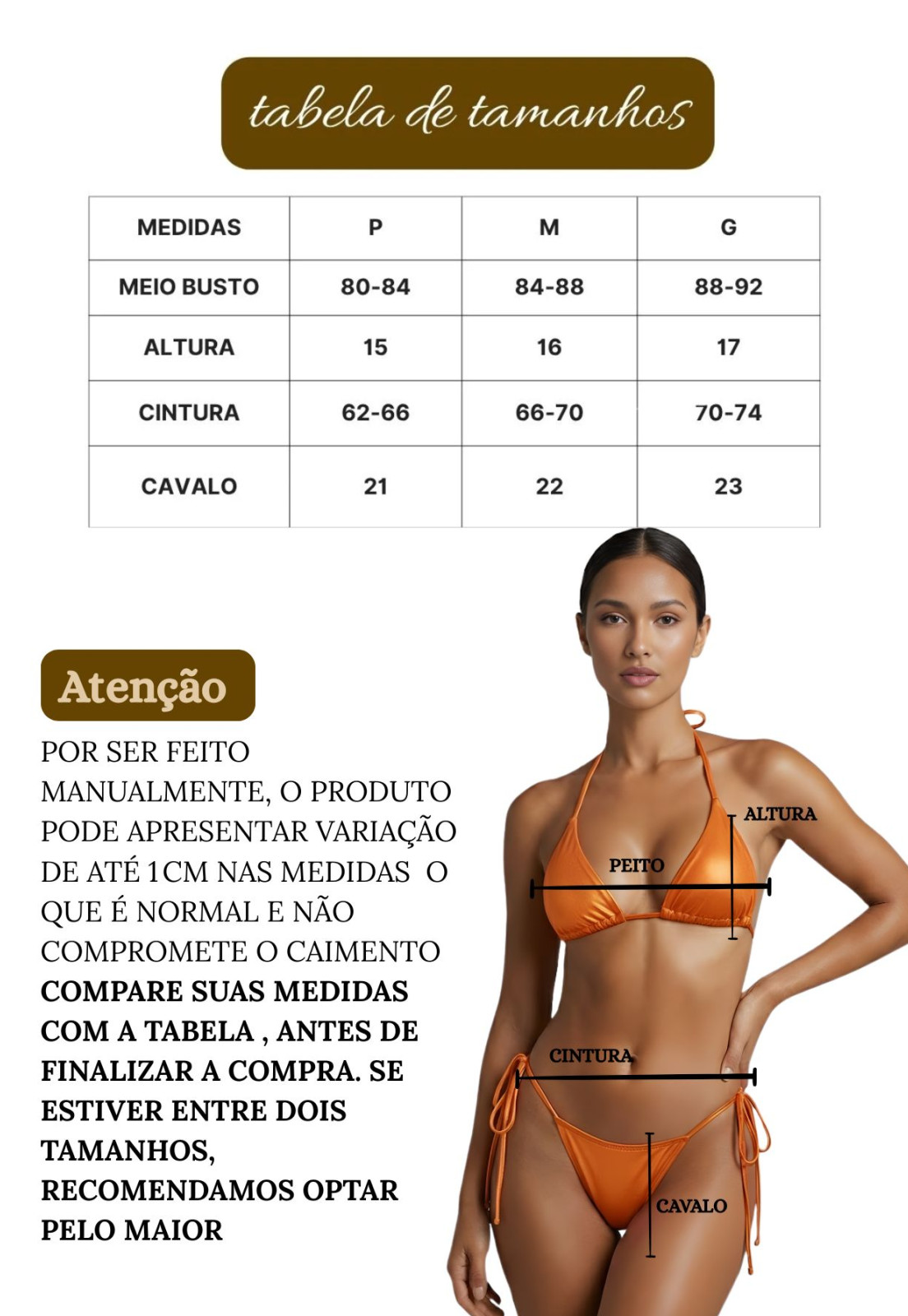 Compare suas medidas com a tabela , antes de finalizar a compra. Se estiver entre dois tamanhos, recomendamos optar pelo maior