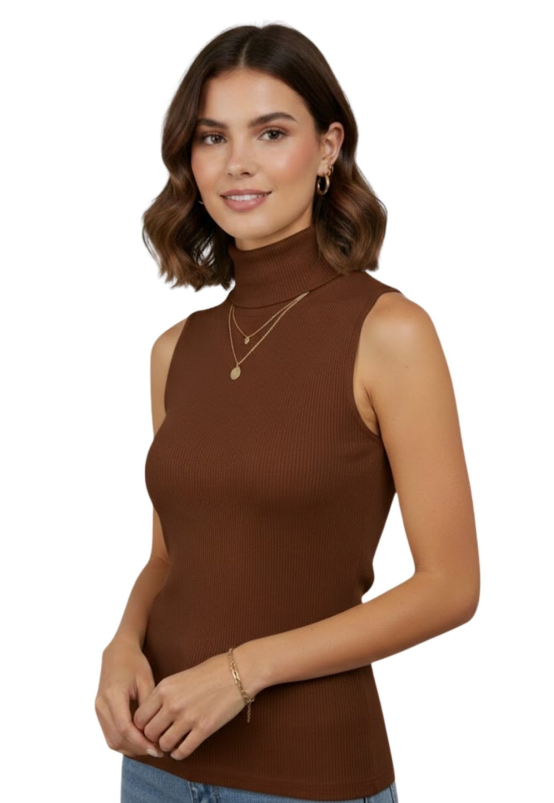 Confeccionada com um tecido canelado de alta qualidade, esta blusa oferece uma textura rica e um toque incrivelmente macio na pele. Sua modelagem ajustada, mas com a elasticidade ideal, abraça o corpo de forma lisonjeira, realçando a silhueta sem apertar. A gola alta, um ícone de requinte, alonga o pescoço e adiciona um toque instantâneo de classe a qualquer look. A tonalidade marrom/caramelo profunda é um neutro chic e versátil, fácil de combinar e perfeito para transitar entre as estações.