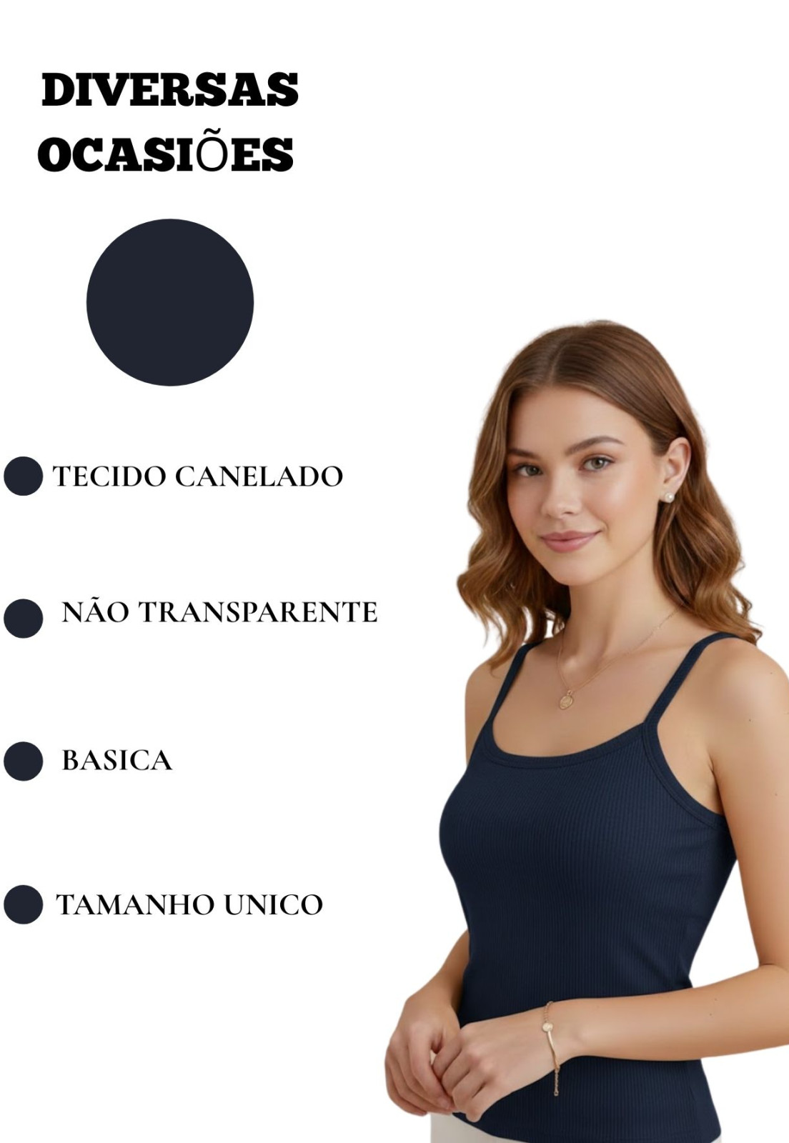 - Design Minimalista e Elegante: Suas alças finas e o decote redondo clássico conferem um visual clean e versátil, tornando-a a tela perfeita para seus acessórios e sobreposições. Uma peça curinga que transcende tendências.